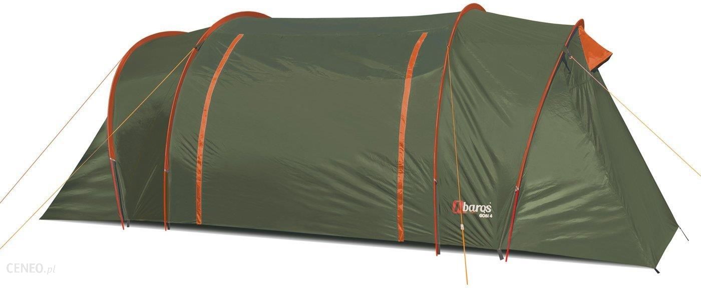 Namiot turystyczny AbarQs model Gobi 4 to sprawdzona koncepcja typu tunel, jako podstawa stabilnego, samonośnego namiotu.Namiot posiada w przedsionku podłogę z burtami.Dzięki małej masie, łatwości rozkładania i dużemu komfortowi sprawdza się na krótkich wypadach jak i na campingu.Ten namiot jest to połączenie wysokiej jakości i dobrej ceny.Opis namiotu Gobi (A,B)· Przestronny namiot dla 4 osób.· Doskonały na wycieczki rowerowe, biwaki, spływy kajakowe.· Nowoczesna konstrukcja, z pionowymi ściankami.· Posiada przestronny przedsionek i dużo miejsca w sypialni.· Namiot można bezpiecznie rozbić w deszczu, rozkładając najpierw tropik a następnie podwiesić sypialnię pod tropikiem, który ochroni ją przed zamoczeniem.· Powłoka zewnętrzna pokryta specjalnym impregnatem zabezpieczając prze skutkami promieniowania UV· Sypialnia w kolorze czarnym zwiększa komfort snu szczególnie w godzinach porannych (tylko kolor A Szary).· Wewnątrz sypialni znajduje się praktyczna kieszeń.· Wszystkie szwy tropiku laminowane taśmą wodoodporną.· Wszystkie naciągi w jaskrawym kolorze, poprawiającym ich widoczność.· Unikalne rozwiązania sprawiają że rozbijanie przebiega bardzo sprawnie i szybko.· Wzmocnione czerwone pałąki z włókna szklanego gwarantują stabilność konstrukcji.Dane Techniczneo Ilość osób: 4o Waga: 7 kgo Materiał tropiku: poliester 190To Wodoodporność tropiku: 3000mmH2Oo Ochrona na promieniowanie UV: 30+o Materiał podłogi: polietylen PE 120, 9000mmH2Oo Materiał sypialni: oddychający poliester-czarna(A)o Wymiary sypialni: 225x125x160 cm (dł. x szer. x wys.)o Wymiary przedsionka: 225x200x180 cm(szer. x dł. x wys.)o Wymiary pakunku: Ø24 x 65 cmo Wejścia: 2o Materiał pałąków: włókno szklane, kolor czerwony,fi8mmo Szwy: wodoodporna taśmao Szpilki: stalowe ocynkowaneo Odciągi: odblaskowe