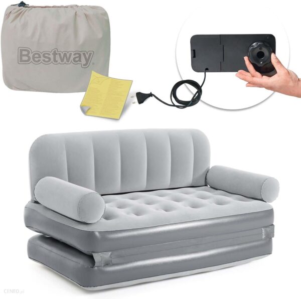 Sofa dmuchana z wbudowaną pompką✔ dwuosobowy o wymiarach: 188 x 152 x 64 cmGłówne cechy:wygodny i trwały,stabilny, dzięki technologii Coil-beam,z wbudowaną pompką.Co zawiera zestaw?dwuosobowy materac Bestway o wymiarach: 188 x 152 x 64 cm,wbudowaną pompkę elektryczną,dedykowaną torbę,łatkę naprawczą.Materac dla niespodziewanego gościa▶ komfortowy rozmiarRozmiary materaca pozwalają na komfortowe użytkowanie go przez dwie dorosłe osoby.Dlaczego materace Bestway są tak wygodne i wytrzymałe?Technologia TRITECH▶ wytrzymały, trójwarstwowy materiałDzięki wykorzystaniu wytrzymałego, potrójnego materiału, możesz mieć pewność, że materac posłuży przez lata, nie tracąc sprężystości i wytrzymałości.Stelaż Coil-beam – technologia komfortu▶ wewnętrzny stelaż, zapewniający komfortZa stabilność materaca odpowiada jego wewnętrzny stelaż. W materacach Bestway wykorzystano zaawansowaną technologię Coil-beam, opartą na łączeniu dolnej i górnej powierzchni materaca poziomymi pasami.Wbudowana pompka elektryczna▶ pompka wbudowana w materac – chwila i materac gotowy do snu!Każdy materac z wbudowaną elektryczną pompką ma również możliwość nadmuchania go pompką tradycyjną.Dane techniczne:Wymiary: 188 x 152 x 64 cmMateriał: PVC, welurPrzeznaczenie: dwuosobowyZasilanie pompki 220 – 240 V