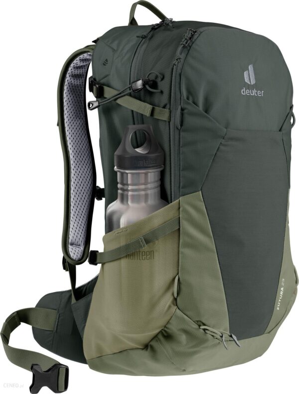 Deuter Futura 23 to plecak najlepiej sprawdzający się podczas wycieczek górskich, turystycznych i rowerowych ale również jako plecak miejski. Wyposażono go w nowoczesny system nośny Aircomfort Sensic System, którego największym atutem jest wytrzymała siatka naciągnięta na dwa pręty. Dzięki takiemu rozwiązaniu między plecakiem a plecami użytkownika powstaje przestrzeń na wentylację. System nośny Aircomfort Sensic stał się połączeniem najwyższego poziomu wentylacji, ergonomicznego dopasowania oraz niskiej wagi. Boczne uchwyty umożliwiają dopięcie kijów lub czekana. Chowany pokrowiec przeciwdeszczowy zabezpieczy go w razie pogorszenia się warunków pogodowych. Główna komora, w przeciwieństwie do większych plecaków zamykana jest na zamek. Wewnątrz przedzielona jest za pomocą ściągacza na dwie części. Z przodu plecak wyposażono w wygodną dużą kieszeń z organizerem. Całkowicie na froncie znajduje się kieszeń wykonana z elastycznej siatki. Z obu stron plecaka znajdują się elastyczne kieszenie z siatki idealne do transportu butelek. Wyposażono go również z troki ściągające dzięki czemu możemy zmniejszyć pojemność plecaka a tym samym zabezpieczyć ładunek przed przemieszczaniem się wewnątrz. Na froncie znajdują się pętle do mocowania uchwytu na kask (uchwyt/siatka nie jest w zestawie). Kompatybilność z systemami nawodnienia daje możliwość zastosowania bukłaków o pojemności do 3 L. Detale Deuter Futura 23: system nośny Aircomfort Sensic System pas biodrowy regulowany pas piersiowy dwie elastyczne kieszenie boczne pokrowiec przeciwdeszczowy kieszeń na cenne drobiazgi przegroda w komorze głównej na mokra odzież lub system nawadniający instrukcja SOS kompatybilny z systemami H20 (bukłak nie jest w zestawie) pętle do mocowania uchwytu na kask (uchwyt/siatka nie jest w zestawie) mocowanie na kije trekkingowe lub czekan organizer w kieszeni frontowej boczne troki kompresyjne troki ściągające przy pasach nośnych pozwalające na lepsze dopasowanie plecaka Specyfikacja: Pojemność: 23 L Waga: 1200 g Wymiary: 52 x 28 x 18 cm Kolor: ivy-khaki Materiał: 210D PA RECYCLED / 600D PES