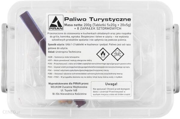 Wydajna podpałka w kostce wytworzona z wysokogatunkowej Heksaminy – bezpiecznego i nietoksycznego paliwa. Dzięki zastosowaniu tylko naturalnych składników paliwo jest całkowicie bezpieczne dla środowiska, pozostawia także bardzo mało sadzy na naczyniu.Polecane zwłaszcza do składanych kuchenek turystycznych oraz jako rozpałka ognisk, grilli i kominków. W zestawie znajdują się dwa zestawy pozwalające na większą elastyczność w czasie przygotowania potraw, a załączone zapałki sztormowe umożliwią w łatwy sposób rozpalić ogień w każdych warunkach.Sposób użycia: Tabletkę umieścić na ruszcie kuchenki bądź pod opałem i podpalić. Paliwo jest od razu gotowe do użycia.Dane techniczneIlość tabletek w opakowaniu: 20 szt. x 5 g + 5 szt. x 20 gIlość zapałek w opakowaniu: 8 sztukCzas palenia jednej tabletki: małe 8-10 minut, duże 10-15 minutWaga: 200 gProducent: Piran, Polska
