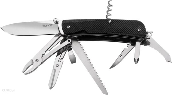 Ruike LD51-B to kieszonkowy nóż wielofunkcyjny wyposażony w 23 użyteczne narzędzia, blokowane ostrze rozkładane jedną ręką oraz praktyczny klips do przenoszenia.Scyzoryk został wykonany ze szwedzkiej stali nierdzewnej Sandvik 12C27 (58-59) HRC, która ma świetne właściwości tnące, długo zachowuje ostrość, jest łatwa do ostrzenia i odporna na działanie korozji.Okładziny Ruike LD51 wykonano z kompozytu G10, wytrzymałej mieszanki włókna szklanego i żywicy.Agresywne teksturowane rękojeści gwarantuje pewny i wygodny chwyt noża. Nad bezpieczeństwem użytkowania głównego ostrza czuwa niezawodna blokada liner-lock.Scyzoryk został wyposażony w klips, dzięki któremu możemy nosić go w kieszeni jak klasyczny folder, a także mocować na pasie lub oporządzeniu. Stalowe kółko pozwala na wplecenie oplotu z paracordu lub mocowanie scyzoryka do kluczy.Funkcje i narzędzia:ostrze główneszczypceobcinacz do drutuszczypce wędkarskienożyczkizaginarka do drutuotwieracz do butelekduży wkrętak płaski 6,5 mmnarzędzie do zdejmowania izloacji/ zaginarka piła do drewnaproste ostrzerozwiertaknarzędzie do zdejmowania izloacjiklucz do szprychszydłowkrętak krzyżakowy ostrze do cięcia pasówmały wkrętak płaski 3 mmstalowy klipskorkociągzbijak do szybkółko do kluczy/ zaczep na linkępęseta