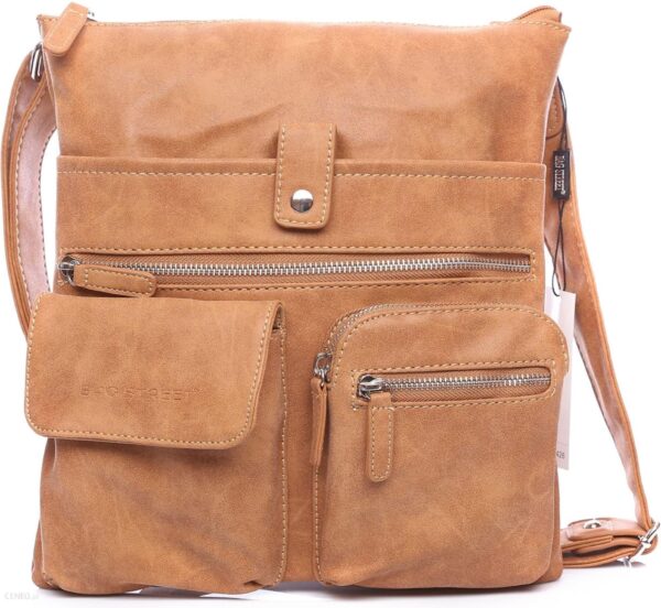 Materiał i wykonanieMiejska torebka damska w kolorze koniakowym (beżowym). Uszyta z wysokiej jakości, miękkiej skóry ekologicznej, w dotyku przypominającej zamsz. Model z dużą liczbą różnych kieszonek w schowków. Okucia wykonane z metalu w kolorze srebrnym.PojemnośćTorba posiada pojemną komorę główną zapinaną na zamek błyskawiczny.Wewnątrz znajduje się kieszonka zapinana na zamek, oraz dwa schowki na telefon i akcesoria.5 dodatkowych kieszonek, różnej wielkości, znajduje się z przodu torby.Z tyłu torby umieszczona jest pozioma kieszeń zapinana na suwak.Torebka posiada długi i regulowany pasek na ramię.MarkaPakowana torebka miejska niemieckiej marki Bag Street.WymiarySzerokość: 30 cm.Wysokość: 28 cm.Maksymalna długość paska na ramię: 140 cm.