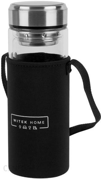 Szklana butelka w zdejmowanym pokrowcu z logo Witek Home.Wypełniona napojem ciekawie się prezentuje.Oprócz nakrętki butelka wyposażona jest również w sitko, które jest bardzo przydatne podczas parzenia herbaty liściastej.